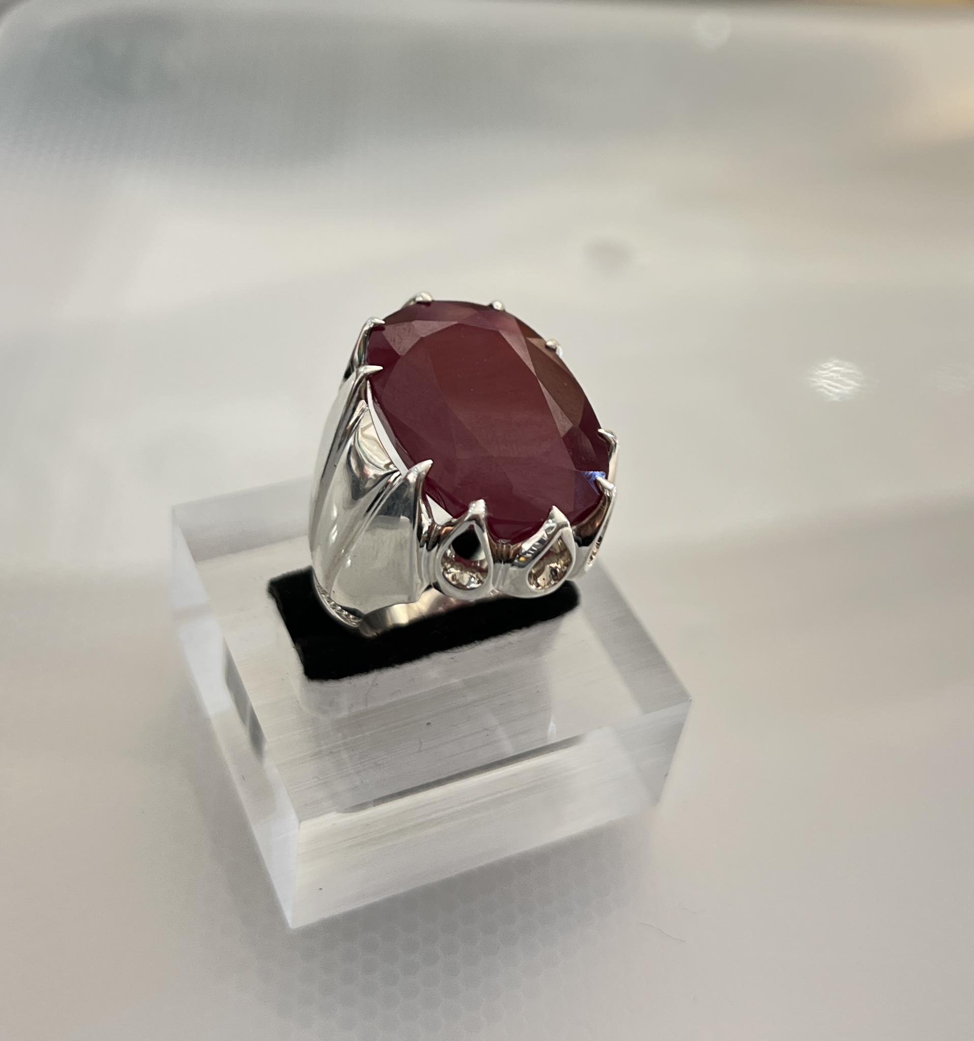 این انگشتر خاص، مزین به یک سنگ یاقوت سرخ طبیعی با تراش بیضی بزرگ و درخشان است که جلوهای شاهانه به آن بخشیده است.